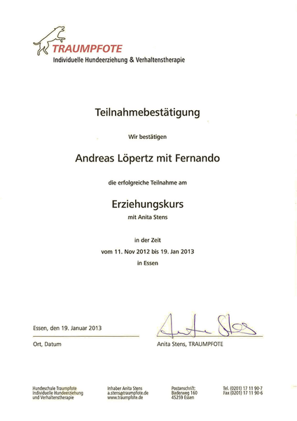 Ich habe, wie Du sehen kannst, am 19.01.2013 den Erziehungskurs (Unterordnung) in der Hundeschule als bester Teilnehmer von allen bestanden.